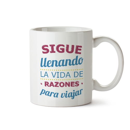 Las tazas con mensaje son un regalo promocional de mucho atractivo, esta taza lleva grabado el mensaje "Travel is the only thing you buy that make you richer". Anima a tus clientes a coleccionar experiencias con esta taza cada mañana. Es un regalo promocional original, atractivo y barato. El precio incluye marcaje por sublimación a todo color.